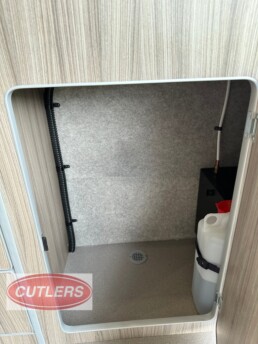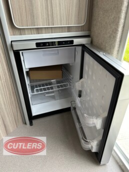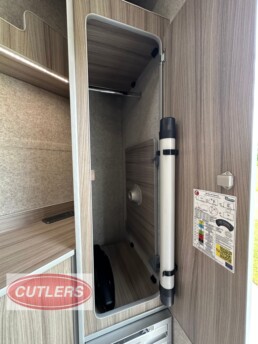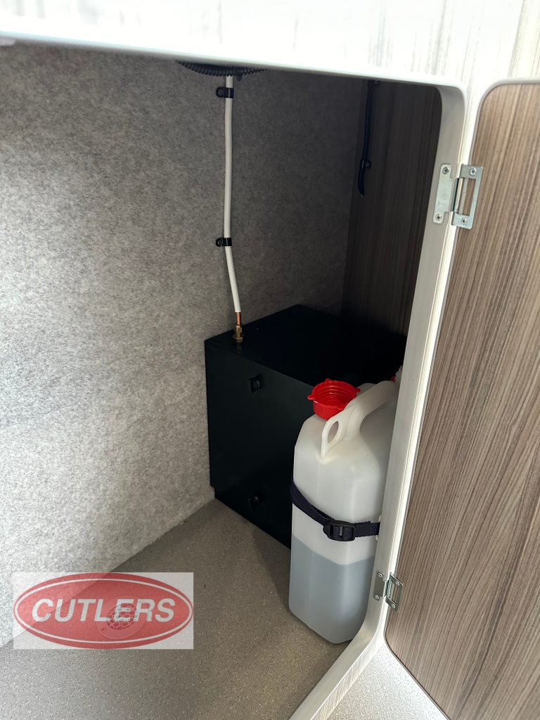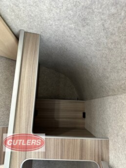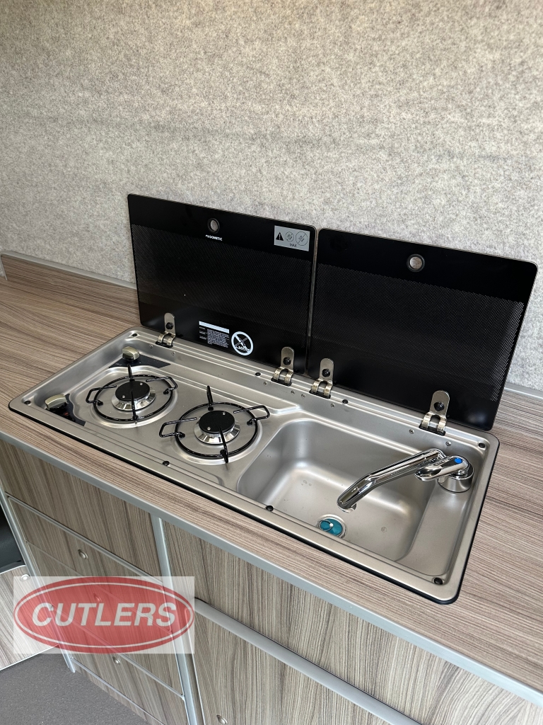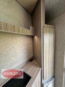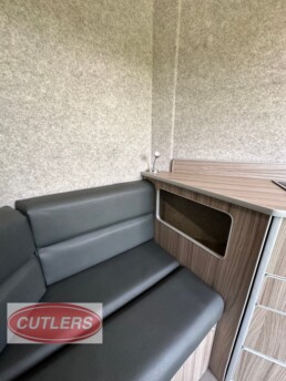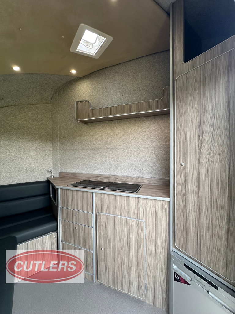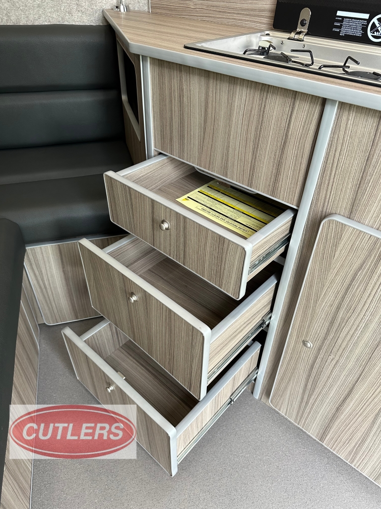 Enjoy every journey with a large seating area, sliding bed frame (converting to a small double bed), and ample under-seat storage. The fitted cupboards, shelves, and collapsible desk/table area make it ideal for overnight stays or long-distance travel.